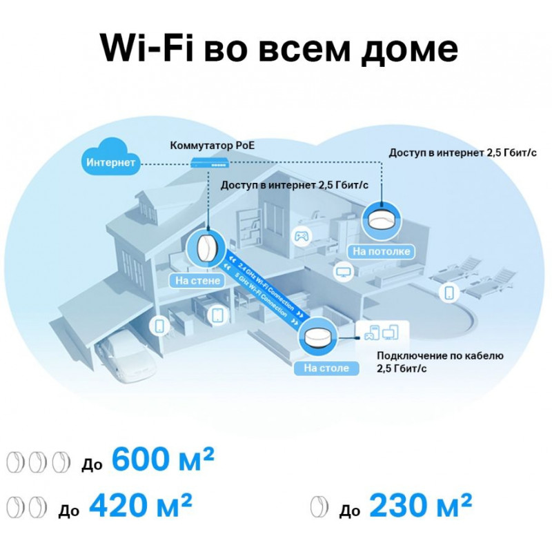 | Описание | Два диапазона Wi-Fi - до 574 Мбит/с на 2,4 ГГц + до 2402 Мбит/с на 5 ГГц. Разные способы установки |