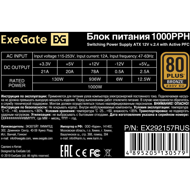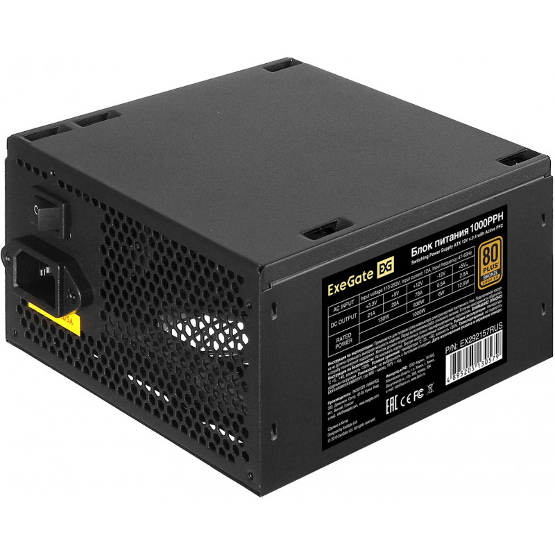 Блок питания Exegate ATX 1000W 1000PPH 80+ bronze (20+4pin) APFC 120mm fan 8xSATA