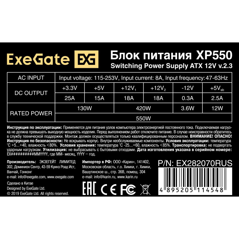 Блок питания Exegate ATX 550W XP550 (20+4pin) 120mm fan 3xSATA