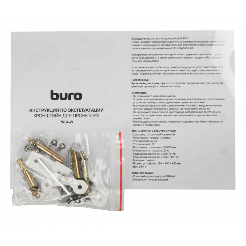 Кронштейн для проектора Buro PR04-W белый макс.20кг потолочный поворот и наклон