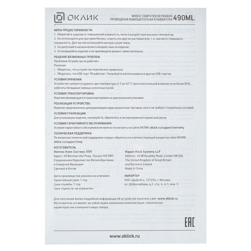 | Размеры клавиатуры | 442.3x30.6x141мм |