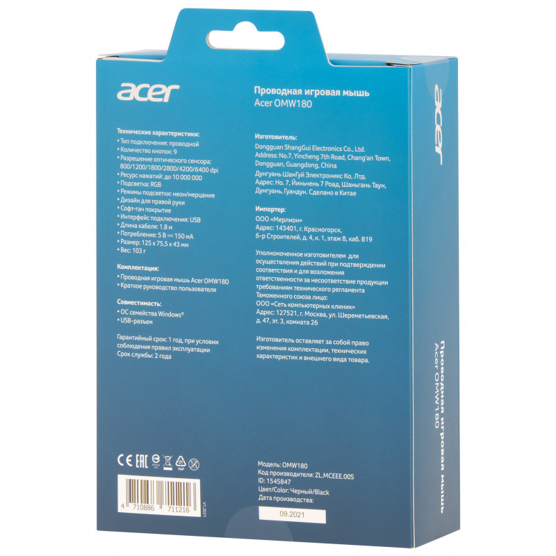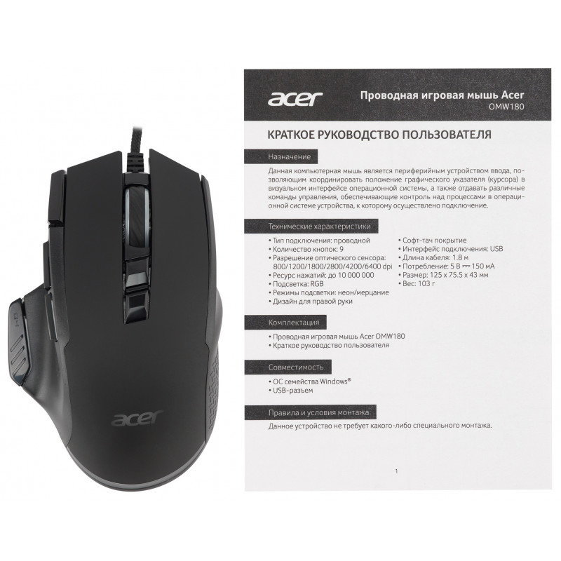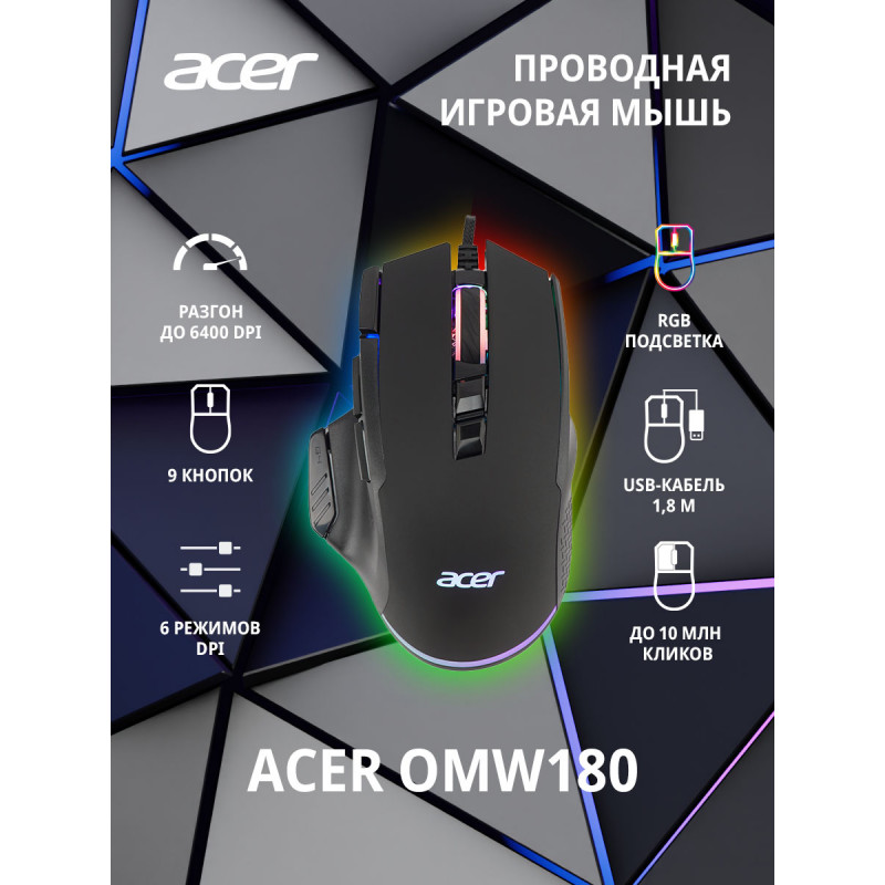Мышь Acer OMW180 черный оптическая 6400dpi USB 9but (ZL.MCEEE.00S)