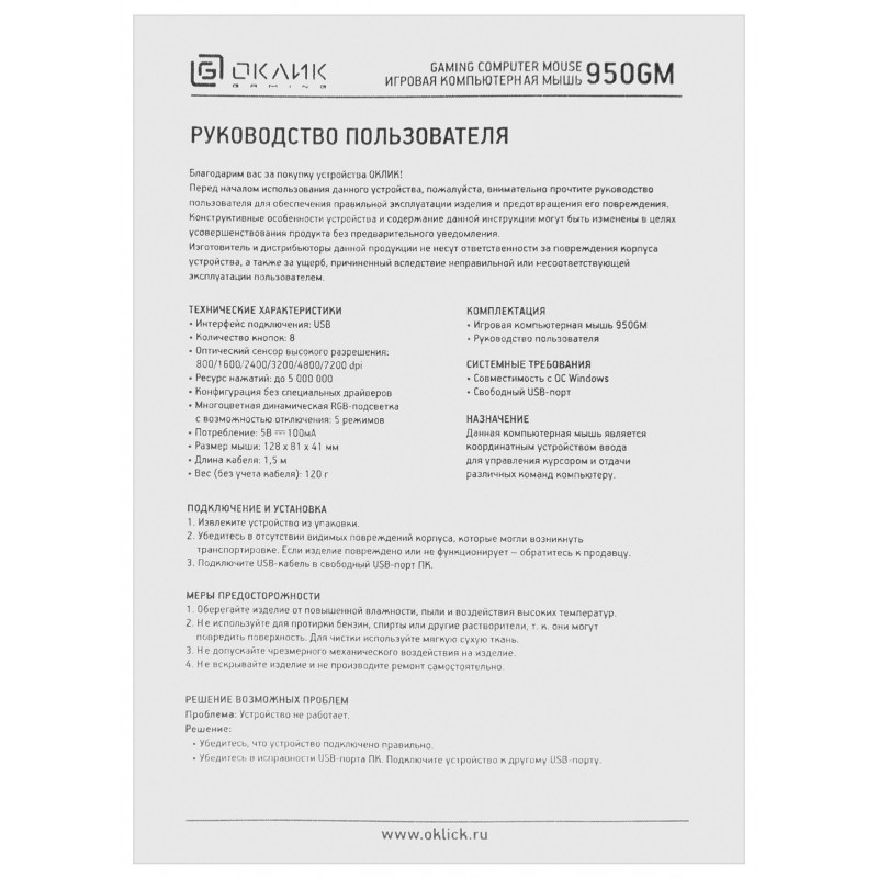 | Комплект поставки | Игровая компьютерная мышь 950GM |
