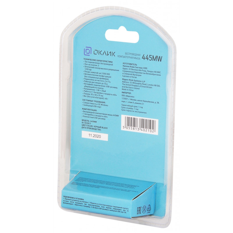 | Комплект поставки | Беспроводная оптическая мышь 445MW 2 батарейки стандарта «AAA» USB-ресивер |
