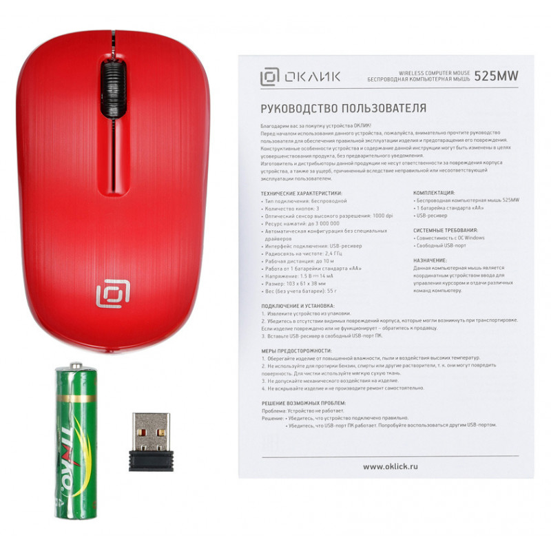 | Комплект поставки | Беспроводная компьютерная мышь 525MW, 1 батарейка "AA", USB-ресивер |