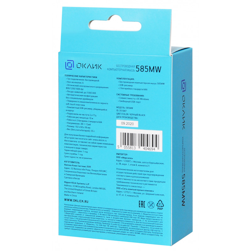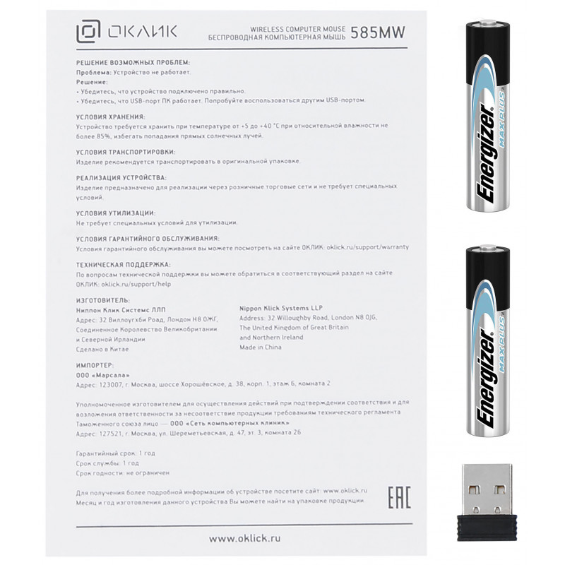 | Комплект поставки | Беспроводная компьютерная мышь 585MW USB-ресивер 2 батарейки стандарта «AAA» |