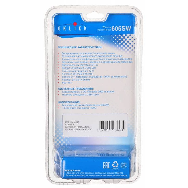Мышь Оклик 605SW черный оптическая 1200dpi беспров. USB для ноутбука 3but (384108)