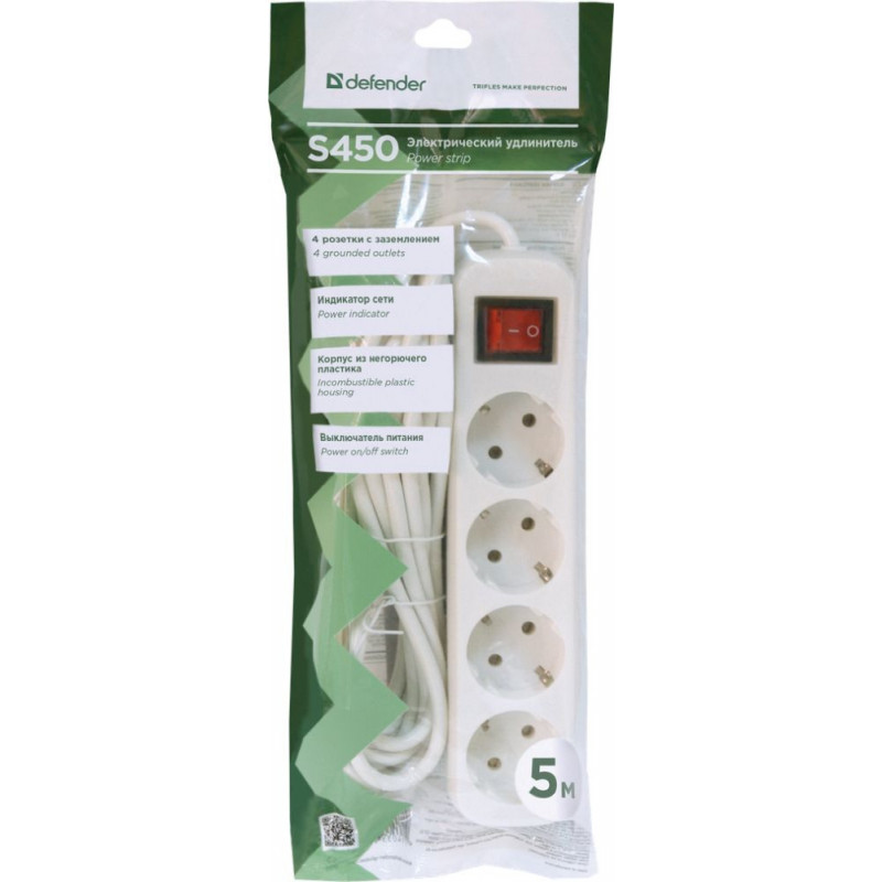 Сетевой удлинитель Defender S450 5м (4 розетки) белый (пакет ПЭ)