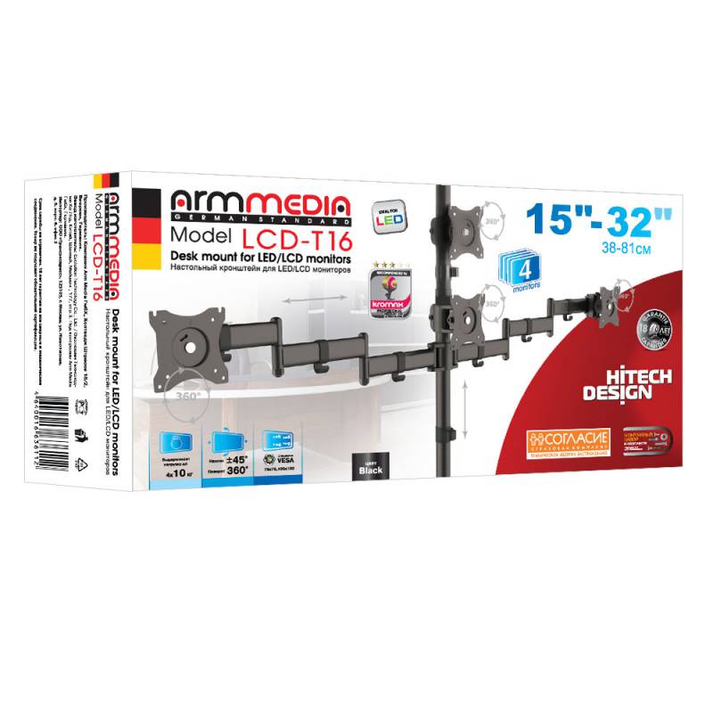 | Описание | Универсальное настольное крепление с горизонтальным размещением 4 мониторов. Два варианта установки |