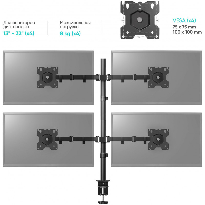 | Описание | Настольный кронштейн для четырех мониторов, ONKRON D421E подходит для мониторов и телевизоров диаго |
