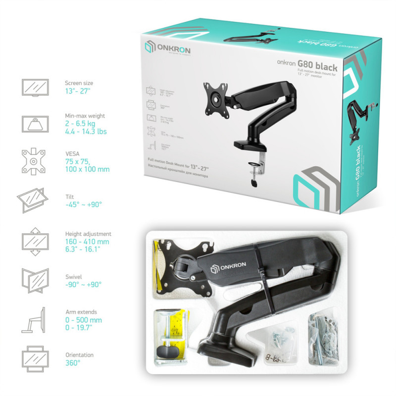 | Описание | ONKRON G80 - это стильный настольный кронштейн для одного монитора. Он подходит для большинства комп |
