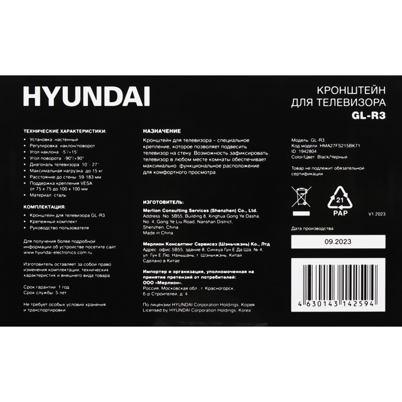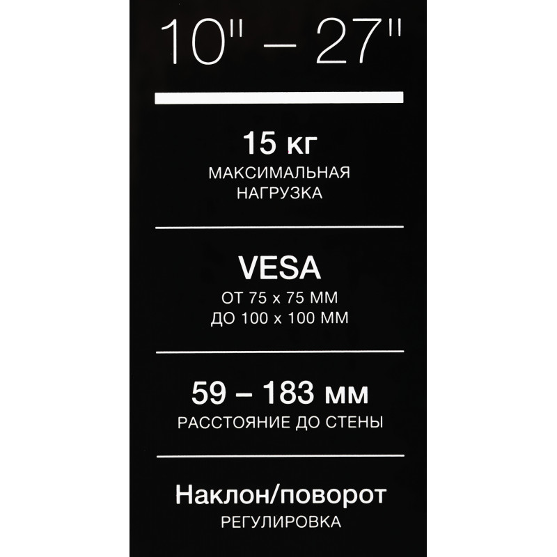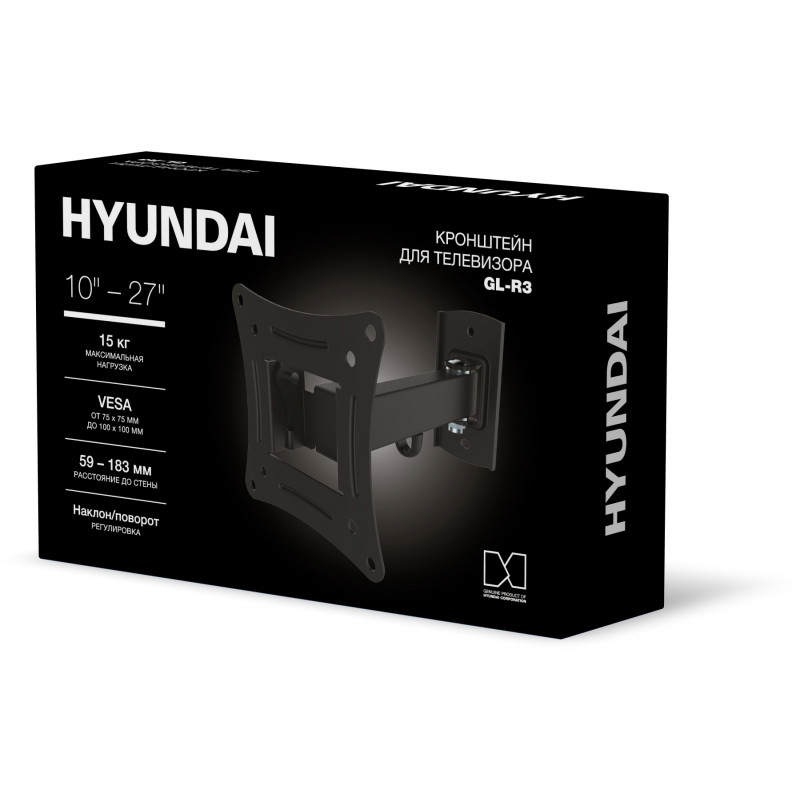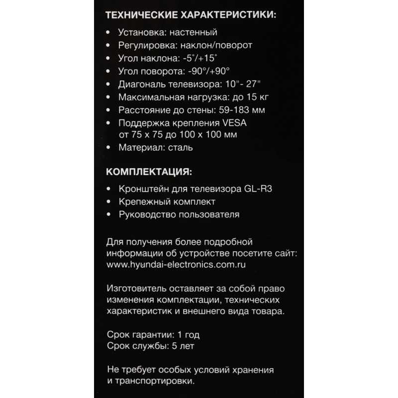 Кронштейн для телевизора Hyundai GL-R3 черный 10"-27" макс.15кг настенный поворот и наклон
