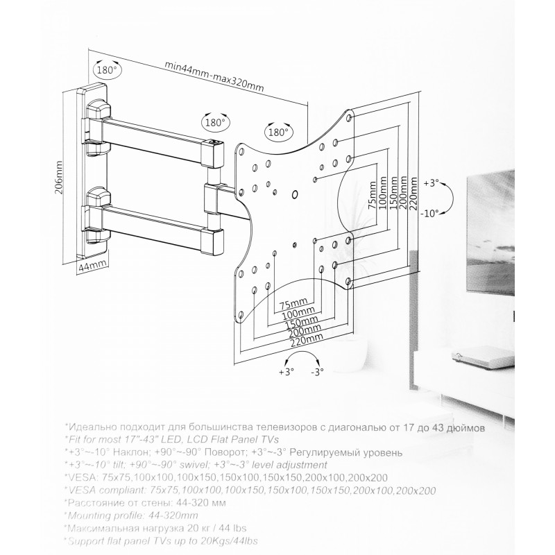 Кронштейн для телевизора Ultramounts UM867 черный 23"-42" макс.20кг настенный поворот и наклон